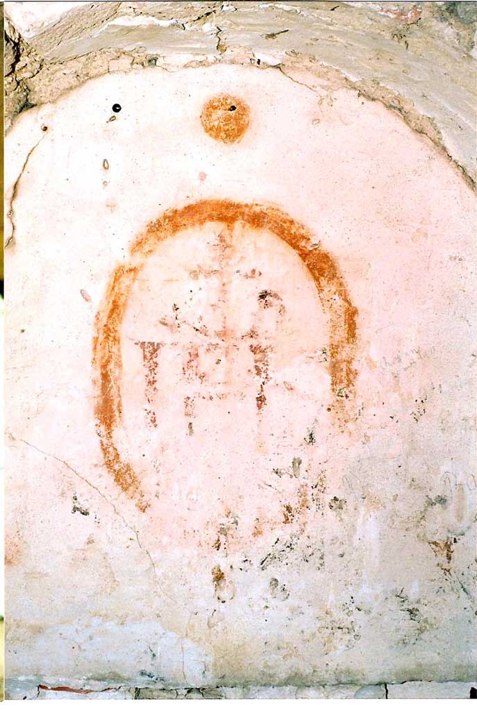 Peintures murales de la chapelle: détail d'un médaillon orné IHS après entretien en 2005 (L. Blondaux).